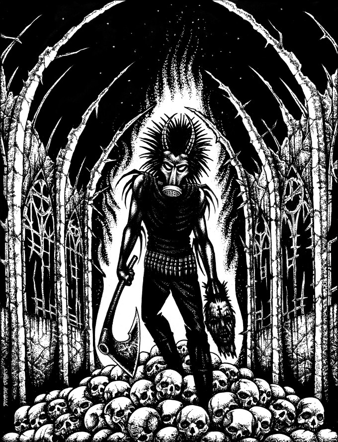 Nesha:Yes it’s a choice, I like to work in black and white, this contrast always gives the picture kind of strength that full color pieces don’t have, at least for me. But also, somehow it was a set of circumstances, cause I draw a lot for fanzines in 90’s and they were always copied black and white so there was no point to make color illustrations, also if you do black on white you just need black pen and piece of paper, which is more practical and cheaper than to have all colors brushes etc.. Sometimes I also use colors in my drawings, and recently I did some color paintings also…cause I came to the point that I can’t visualize all I want just with black and white. When I work with bands, we first discus the ideas for the artwork, than I make a detailed sketch and if people from the band like it,I start with drawing an original artwork…usually it’s simple like that.