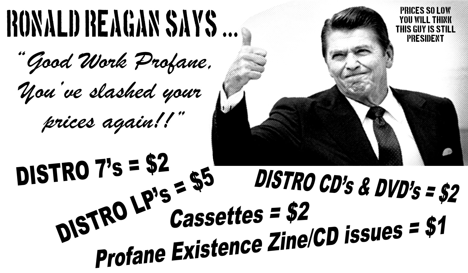 PROFANE EXISTENCE has a web store filled with records, shirts, zines, tapes, patches, pins, CD's and more. Check it often as we are constantly adding new items to the list and selling out of old ones.