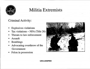 At the same time, the FBI is conflating a wide range of tactics. People who support anarchists or “black separatists” in their words are conflated with the very small group of people who have engaged in illegal activity. That’s how the FBI is including FOIA requests and civil disobedience as example tactics in a domestic terrorism presentation. Juxtapose this with the tactics of militia extremists and white supremacists, who have murdered, lynched, bombed, assaulted government officials and created weapons of mass destruction.