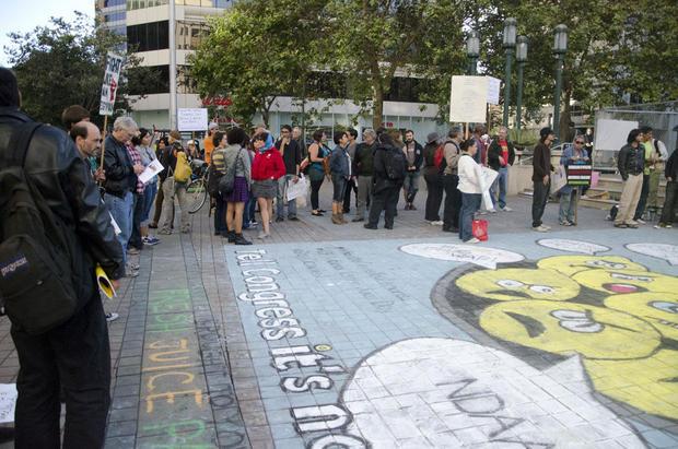 Occupy Oakland members turned out in Oscar Grant Plaza in downtown Oakland, CA on Friday, carrying banners and placards and handing out pamphlets to the public, about the recent shooting of striking miners at the Lonmin PLC Marikana platinum mine in South Africa.