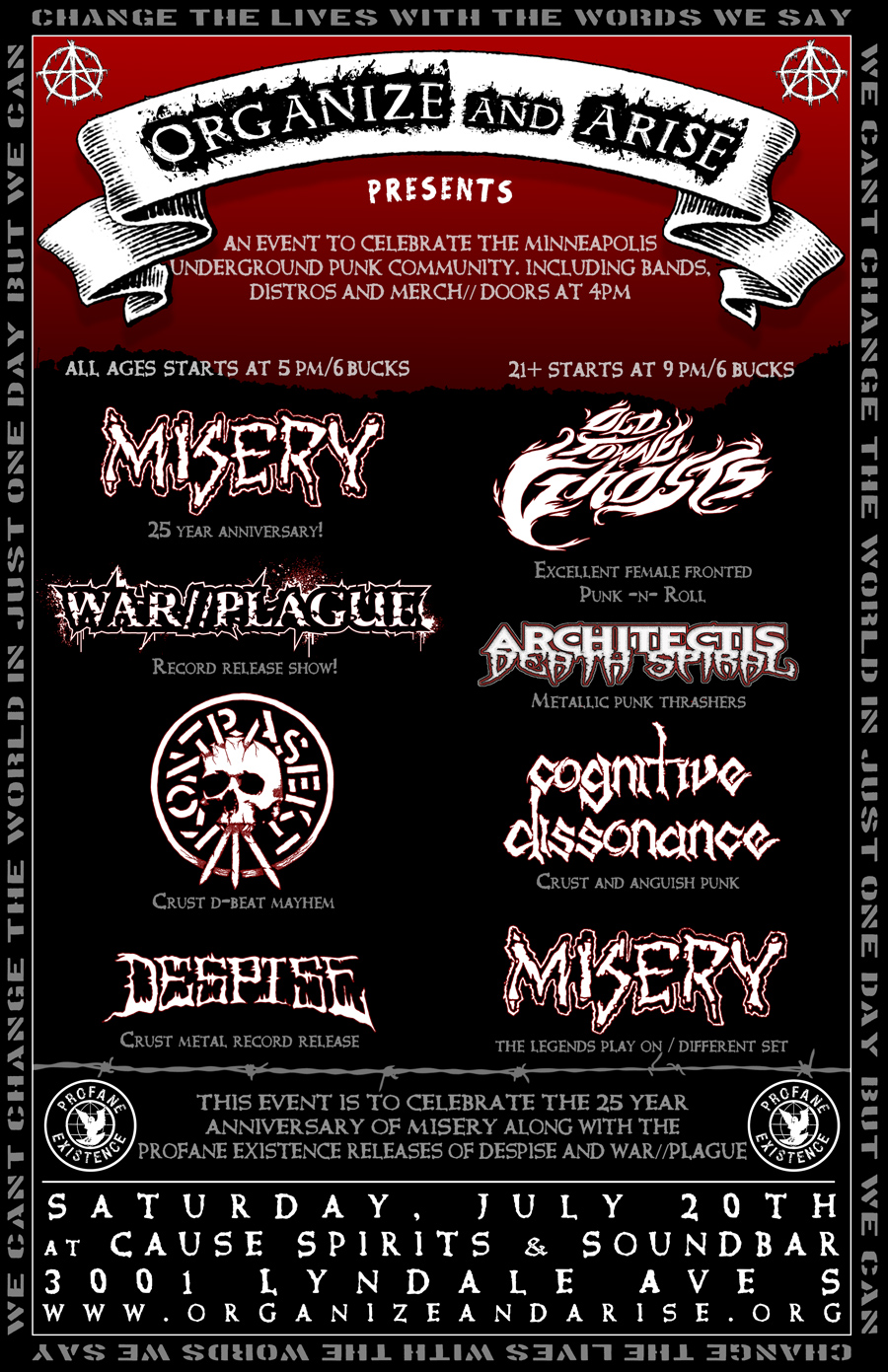 Organize and Arise along with Profane Existence will be setting up shop at Cause Spirits and Soundbar in Uptown Minneapolis to celebrate 25 years of MISERY as they play two gigs. One all ages show and a later 21+ show. Needless to say, this will be a record release show for DESPISE and WAR//PLAGUE, along with many other bands.