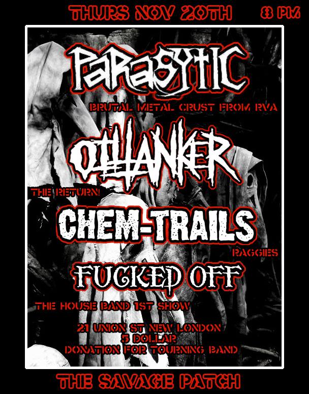 For those of you that have not heard PARASYTIC, I suggest you remedy that situation as soon as possible. PARASYTIC play an absolutely brilliant blend of metal, punk, thrash, and crust. They have been referred to as the United States answer to bands like CONCREATE SOX and THE ENGLISH DOGS. PARASYTIC’s lyrics range from animal rights, to the horrors of war, disgust at puppet politicians, human liberation and much more. With amazing riff’s, harmonizing solo’s, pounding bass, and thunderous drums, combined with Ethan’s onstage antics it is impossible to see PARASYTIC play live and not be impressed. I was fortunate enough to drive PARASYTIC on their first tour in February of 2008. We spent a few weeks on the road starting in Richmond VA and working our down the east/gulf coast all the way to Mexico City and back up the Midwest. Every night was a blast and it never got old seeing these guys play. Spending time getting to know them was even better. PARASYTIC toured extensively in the following few years playing shows all over the United States and spending a month playing the European squat circuit in 2011.